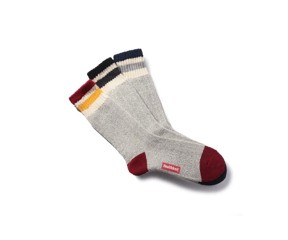 Questi comodi calzini presentano una combinazione di tre righe colorate. Questo set include tre paia di calzini, ognuno con corpo bianco e righe di colori diversi. Il design a righe sul colletto aggiunge un tocco di stile a qualsiasi outfit. Presentano anche una stampa con il logo Healthknit.