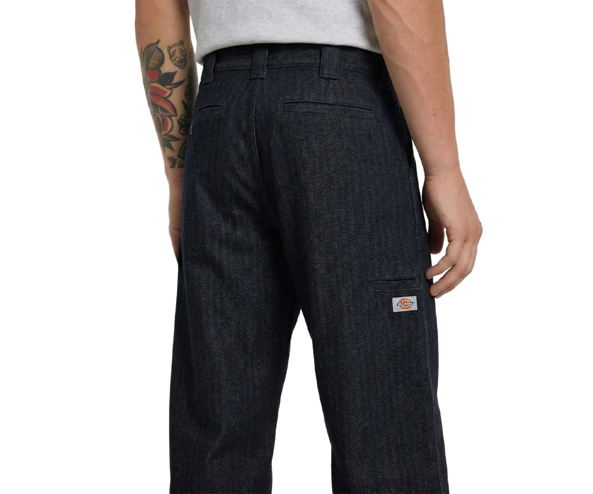 I jeans da lavoro selvedge hanno una vestibilità loose con gamba dritta. Realizzati in denim a spina di pesce da 368 g, presentano piega singola, cuciture invisibili sull’orlo e una tasca per cellulare sul lato destro con etichetta Dickies intessuta. Un capo workwear elevato, che combina materiali premium e costruzione robusta, pensato per chi cerca praticità senza rinunciare allo stile.