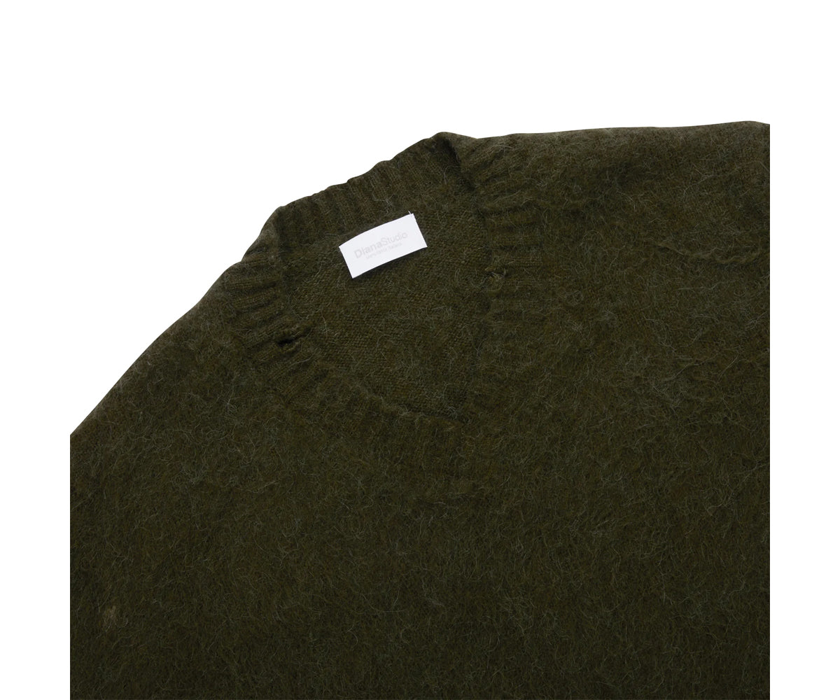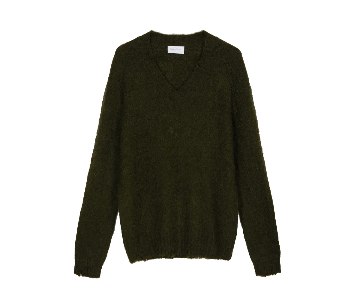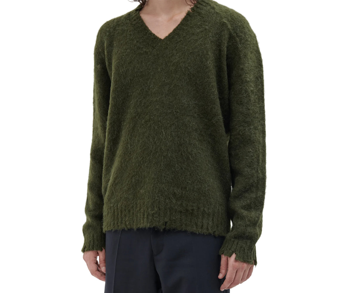 Scollo a V in filato misto alpaca con superficie garzata e dettagli di rottura.