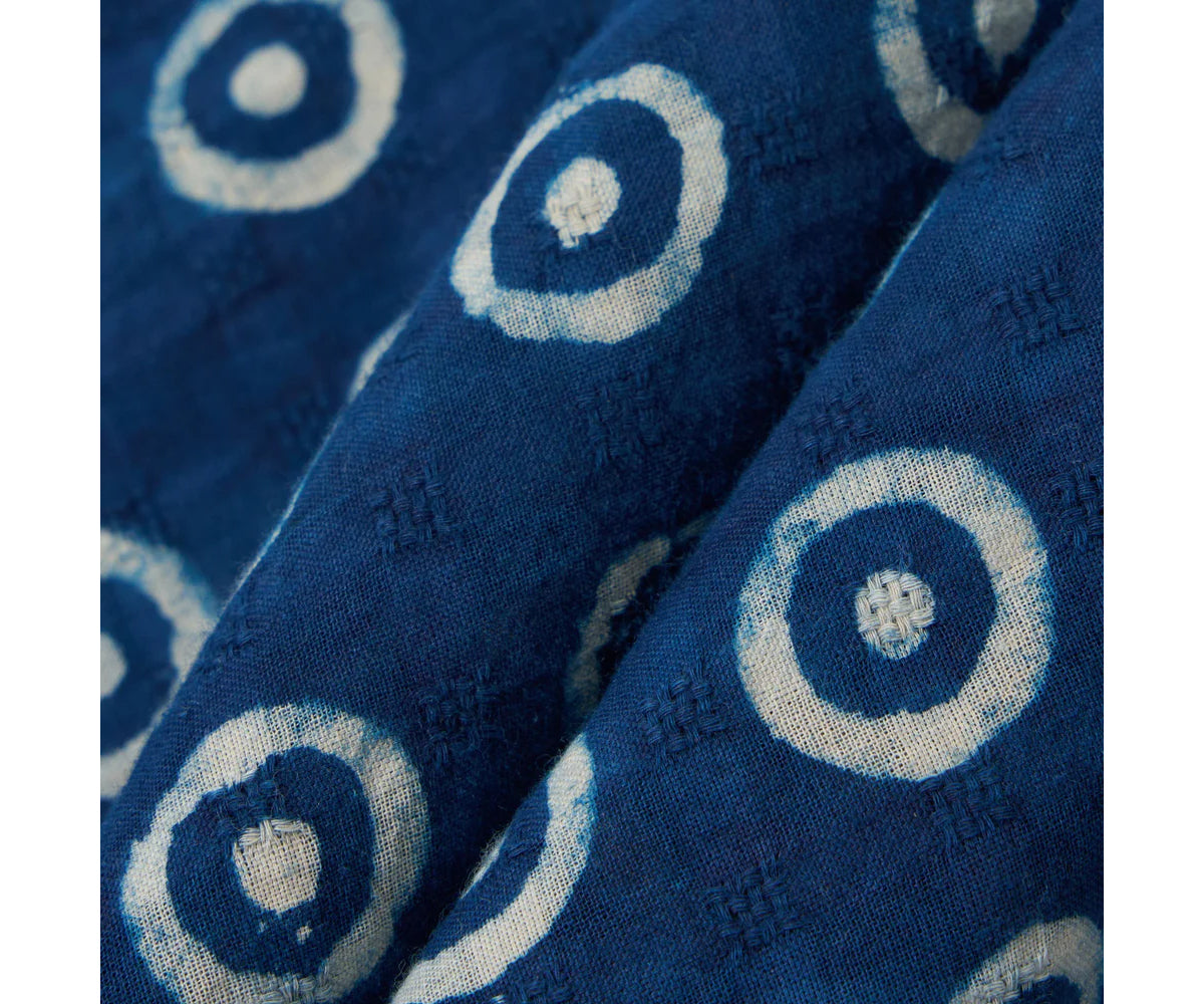 - Un tessuto a quadri super leggero costituisce la base di questo esclusivo tessuto indiano. Il disegno a cerchi è creato tramite tintura a riserva con indaco. Questo capo è tinto con indaco. Prestare attenzione poiché potrebbe verificarsi un leggero trasferimento di colore se indossato vicino a indumenti e mobili di colore più chiaro. Come i vostri jeans preferiti, questo capo sbiadirà gradualmente con l'uso.