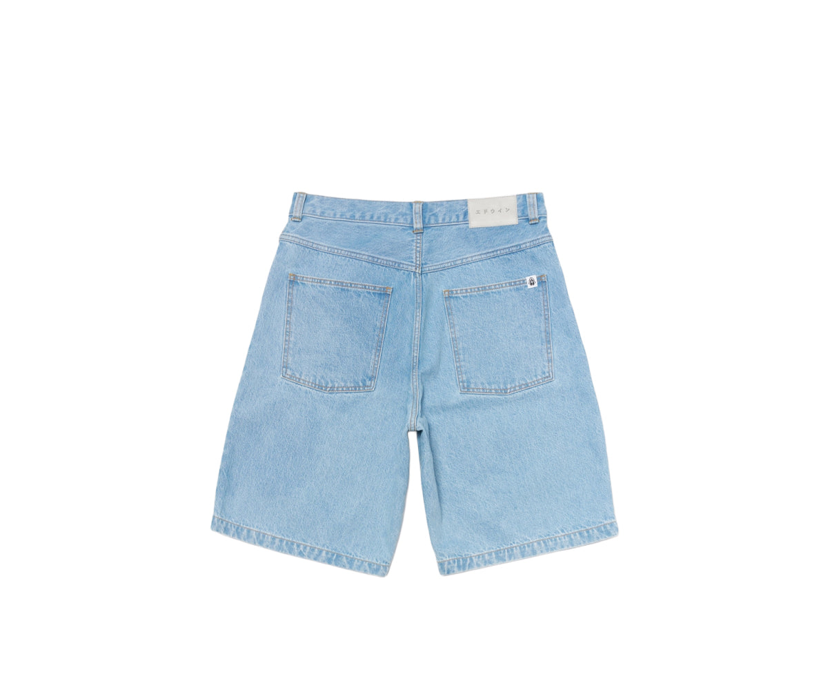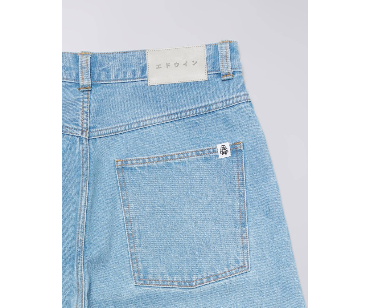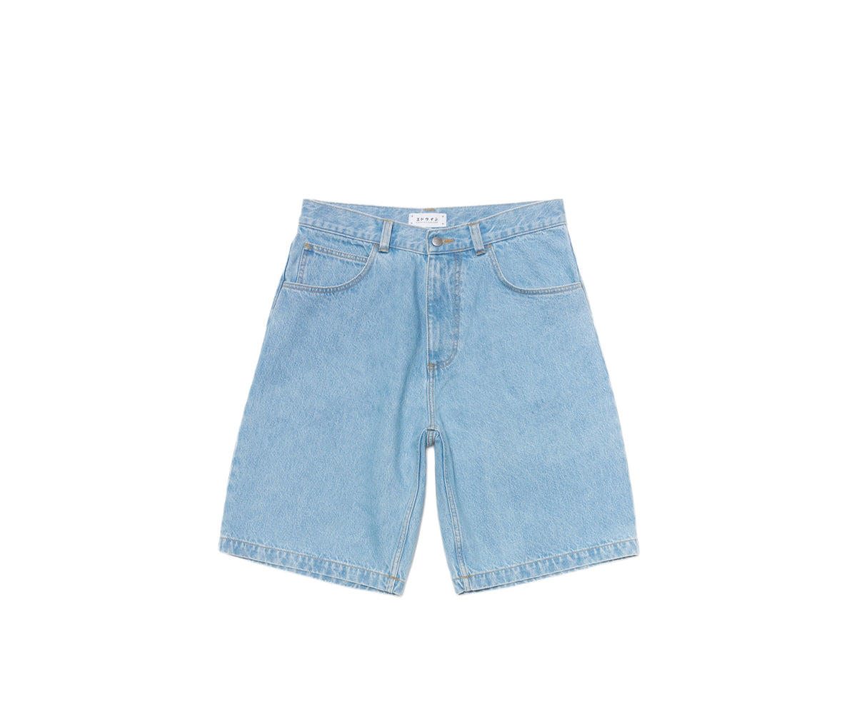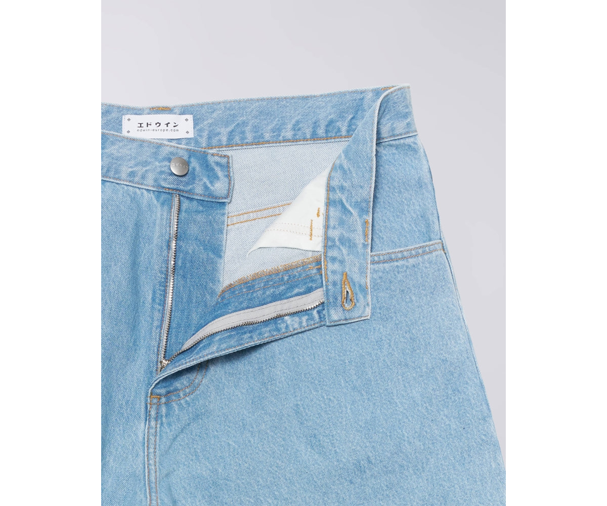 I pantaloncini EDWIN Worker hanno una vestibilità comoda in resistente denim blu artico da 14,6 once con finitura Heavy Bleach per un look vintage distintivo, e sono impreziositi da patta con cerniera, finiture in metallo argentato e un'esclusiva toppa in poliuretano sul retro della cintura.